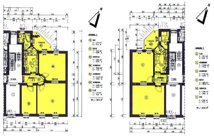 Die in den Grundrissen dargestellten Raumflächen sind Netto-Raumflächen, die der Mietfläche nach Wohnflächen-berechnung (Terrassen- und Balkonflächen zu je 50 % angesetzt) gem. II. Berechnungsverordnung entsprechen. Die dargestellte Möblierung der Küchen ist nur als mögliche Variante zu verstehen. Die Küchenausstattung ist von Seiten des Vermieters nicht geplant und nicht Bestandteil der kalkulierten Kaltmiete.